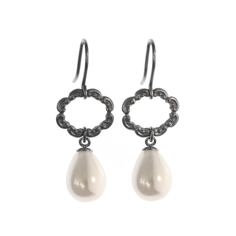 Ohrhänger von AMALA, aus der geheimnisvollen, verzaubernden Schmucklinie Noir, die mit kunstvoll gearbeiteten Schmuckstücken aus dunklem Sterlingsilber den Mondschein einer Sommernacht feiert. Edle Perlen verleihen der festlichen Stimmung Schönheit und Glanz. Die Ohrhänger sind romantisch, verspielt und weisen doch eine klare, dem Zeitgeist entsprechende, Formensprache auf.