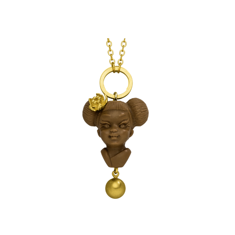 Der außergewöhnliche Materialmix – Schmucksteine, antikes böhmisches Glas und schimmernde Perlen, kombiniert mit handmodellierten Figuren, oft bunt bemalt – sowie die warm goldbraun glänzende Patina des verwendeten Schmuckmessings machen DOLL UP SISTER einzigartig.