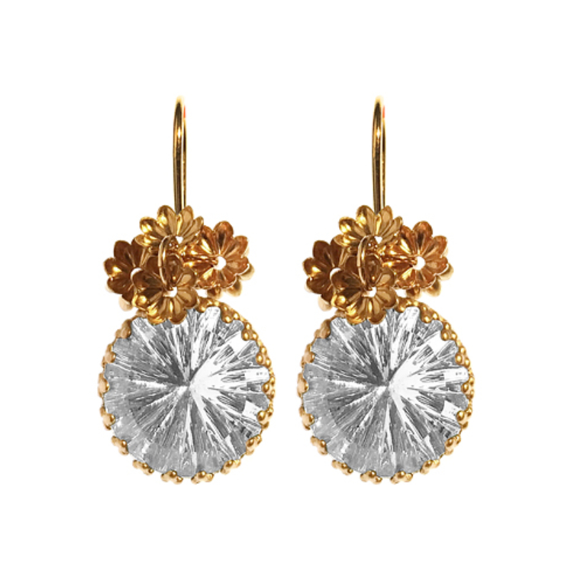 Tauche ein in die sanfte Schönheit der Blüten-Ohrringe von Doll Up Sister. Die feinen Blütenelemente, kunstvoll mit einer echten 750er-Gelbgoldauflage veredelt, strahlen in feiner Eleganz. Im Mittelpunkt jedes Ohrrings leuchtet ein farbiger Glasstein – liebevoll gefertigt in einer kleinen deutschen Glasmanufaktur, die als Familienbetrieb seit Generationen traditionelles Kunsthandwerk bewahrt. Die Steine entstehen auf historischen Pressformen und tragen die kunstvolle böhmische Tradition in sich.